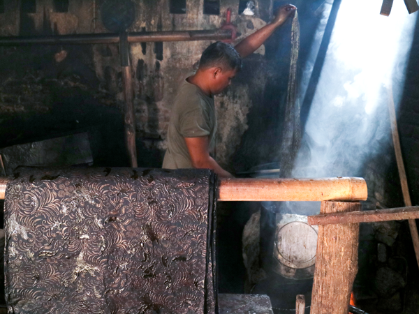 Setelah kain melewati proses perebusan, akanmuncul warna pada background kain, dan juga bagian yang sebelumnya dilapisi malam akan berwarna putih.