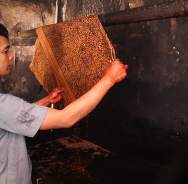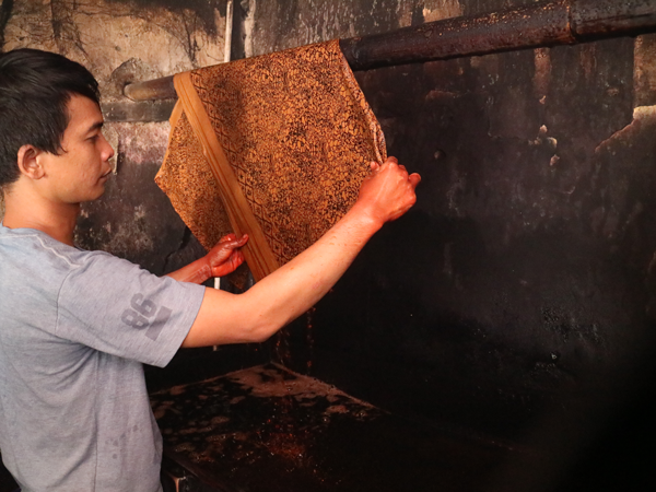 Setelah dicelupkan ke cairan warna, kain batik tersebuit ditiriskan terlebih dahulu agar zat pewarnaan meresap sempurna ke kain. Setelah itu kain akan disiapkan untuk masuk ke proses perebusan.