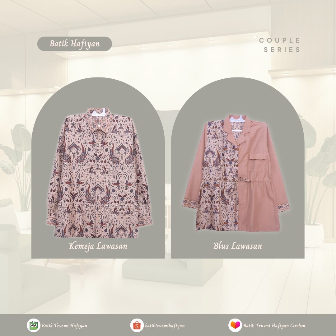 Konsep pada blus lawasan kombinasi polos ini lebih kasual dibandingkan blus yang pertama. Penggunaan kain polosnya hampir separuh dari cuttingan blus dan dipadukan dengan warna batik yang senada. Bisa jadi salah satu inspirasi outfit untuk jalan-jalan, kuliah, atau sekadar pergi ke cafe.