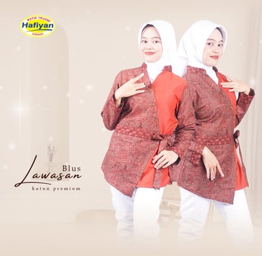 Terbuat dari bahan dasar kain katun primisima yang halus dan tebal di kelasnya. Secara keseluruhan desain blus batik lawasan ini cocok dipadupadan dengan celana jeans atau celana kerja pada umumnya. Bisa di-mix dengan warna netral atau yang senada dengan kain polosnya.
