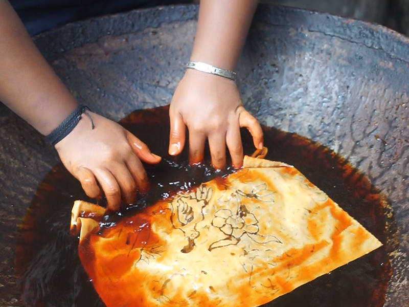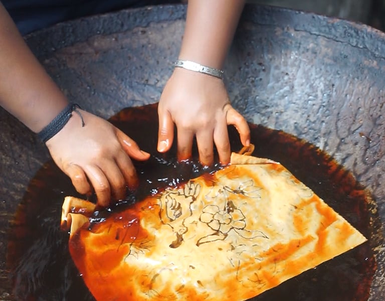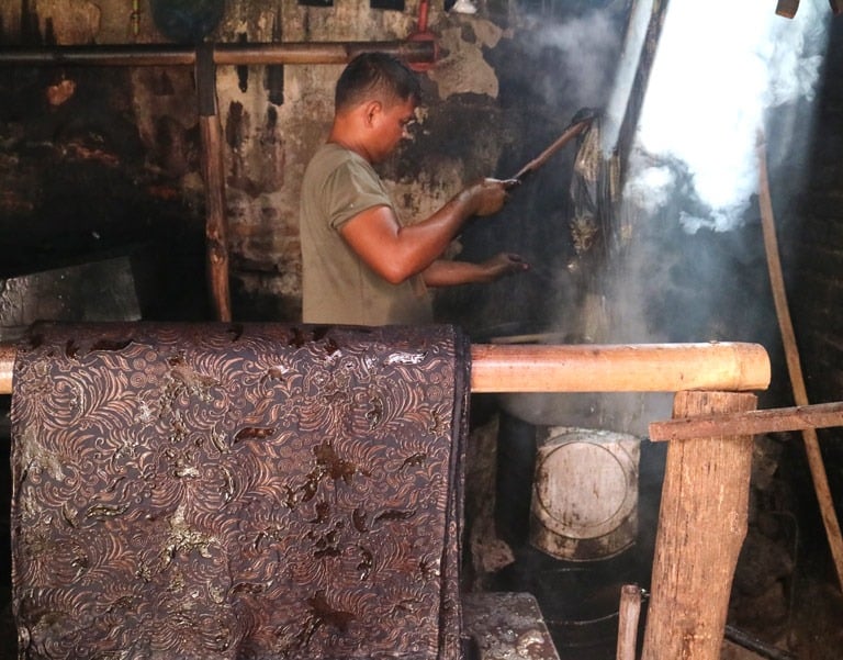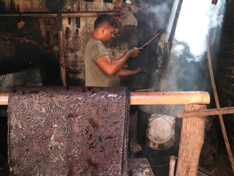 Membatik merupakan proses melapisi kain dengan malam panas yang berfungsi untuk merintangi warna di proses selanjutnya. Di sini lah proses membatik yang sebenarnya.