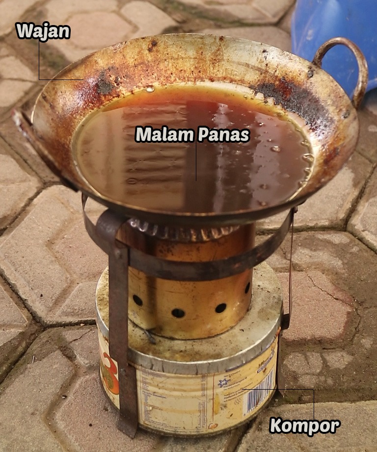 Alat tempur membatik selanjutnya adalah malam panas yang mencair, wajan, serta kompor. Ketiga perlengkapan tersebut tidak bisa dipisahkan mengingat malam harus dalam keadaan panas dan cair, maka dari itu kompor harus selalu menyala.