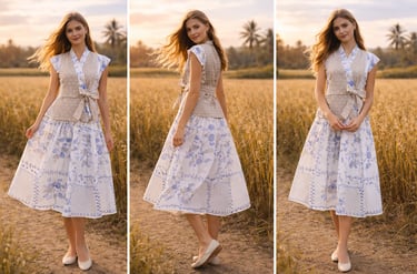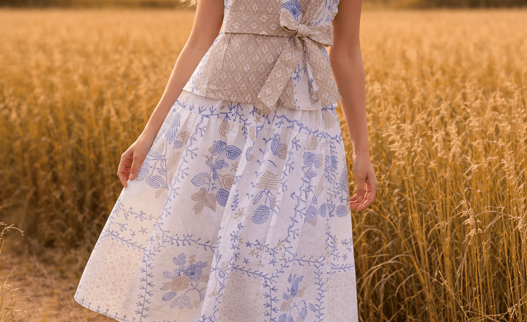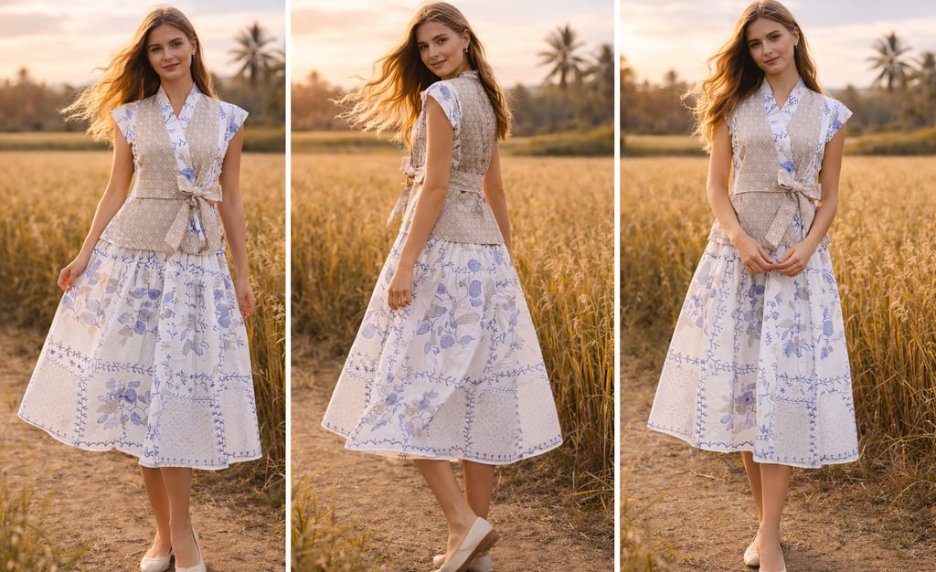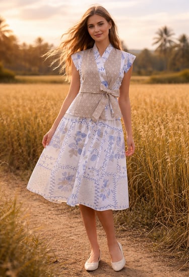 Yang bikin setelan ini unik adalah kombinasi dua item yang saling menguatkan. Dress bermotif dengan potongan yang flowy memberi kesan anggun, lalu ditambah vest warna netral dengan detail ikat pita di bagian depan yang bikin siluet tubuh terlihat lebih rapi. Efeknya seperti “instant styling”, kamu tidak perlu bingung mix and match, tinggal pakai dan langsung jadi. Buat yang suka tampil effortless, ini tipe baju batik yang akan kamu pakai berkali kali tanpa takut kelihatan itu itu saja.